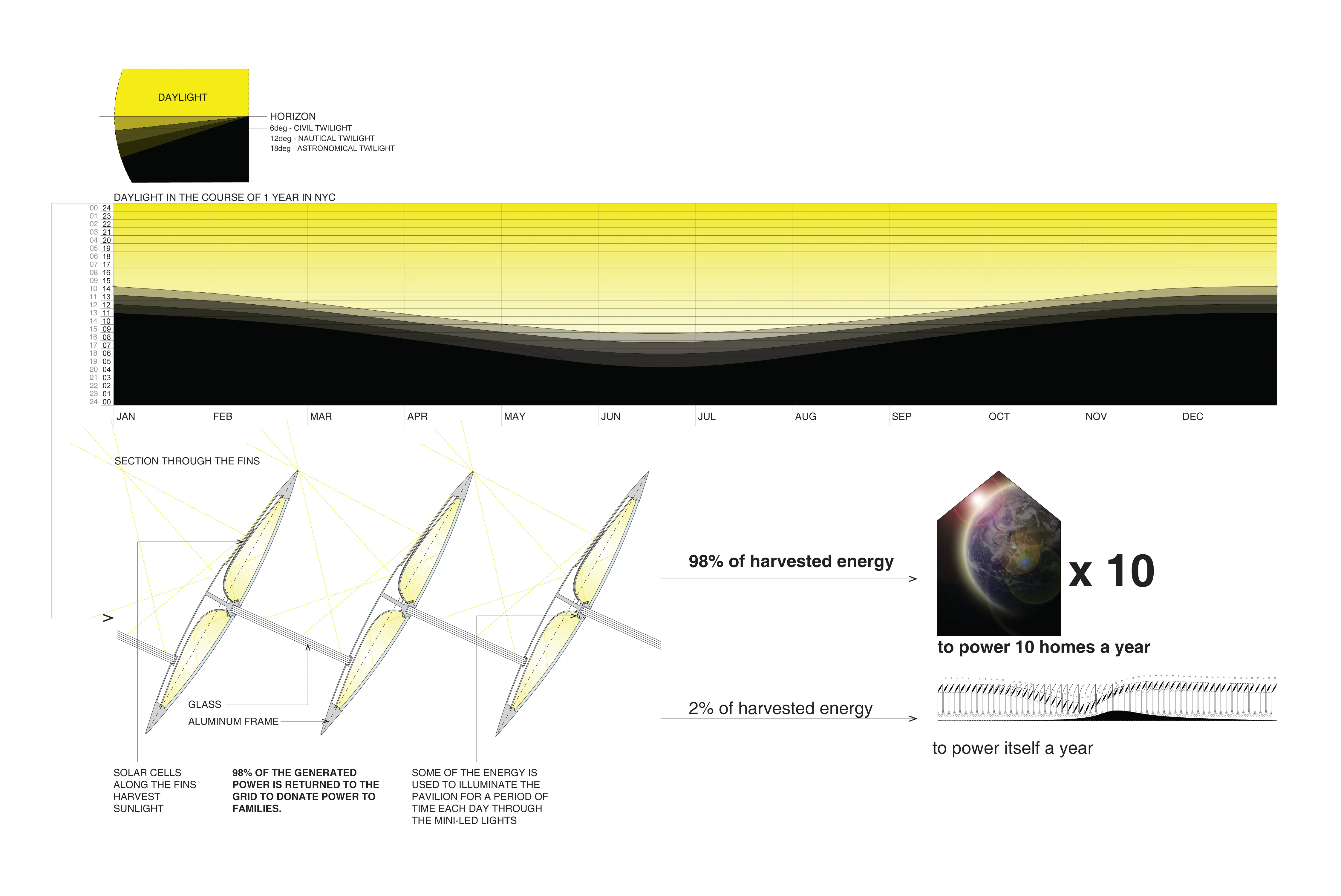 Pavilion 1 is an experiential space enclosed with a responsive skin that changes according to the daily movements of light and darkness. The project explores a design process where the detail is the generator for the configuration of the skin. The structural fins contain both the energy source and emanating source for light, dissipating it during the beginning hours of the evening via integrated thin film and LED technology. The intelligent skin is a performative structure and enclosure system integrating existing technology to define a self-sustaining envelope as a model for future design possibilities.The landscape is pulled into the pavilion, as one can walk through it freely, without ever leaving the surface of the grass. The form in its simplicity reacts atmospherically to the environment around, while responding to the simplest process of life – that of sleep and awakening.