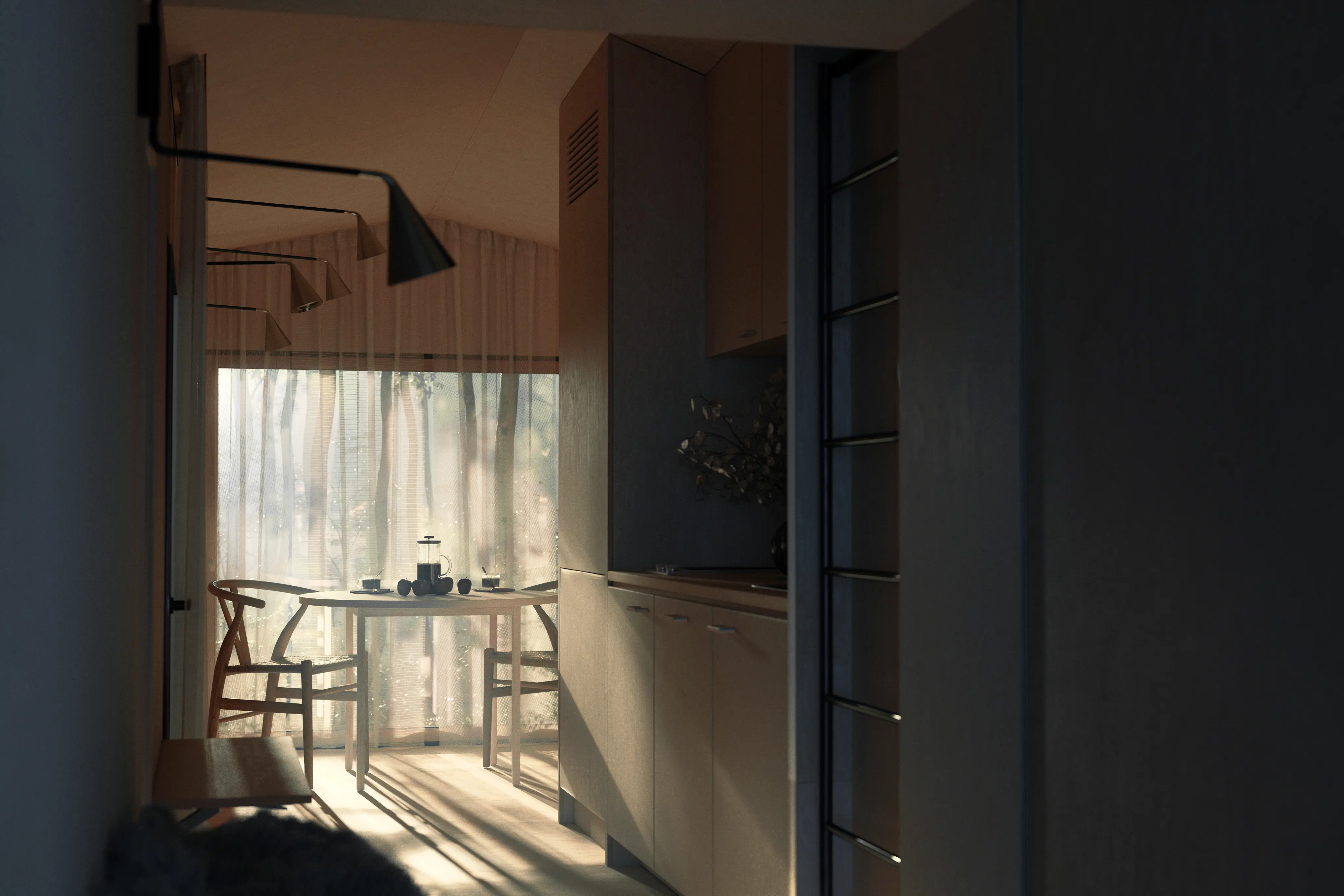 The main concept of the home is the connection with nature. This house offers a unique place that lives in symbiosis with nature. By maximizing the usable space through a fluid form, maximizing light, and using natural materials in a very elegant way the house becomes one with nature wherever it is placed.The interior space acts as a transition between the exterior environment. Light pours into the space from one end to the other through floor to ceiling windows, creating the feeling of being outside. All the main functions are located in a core on the back of the house, so that the kitchen and bathroom are next to each other, and behind them, on the outside is the location for the mechanical and electrical elements.
