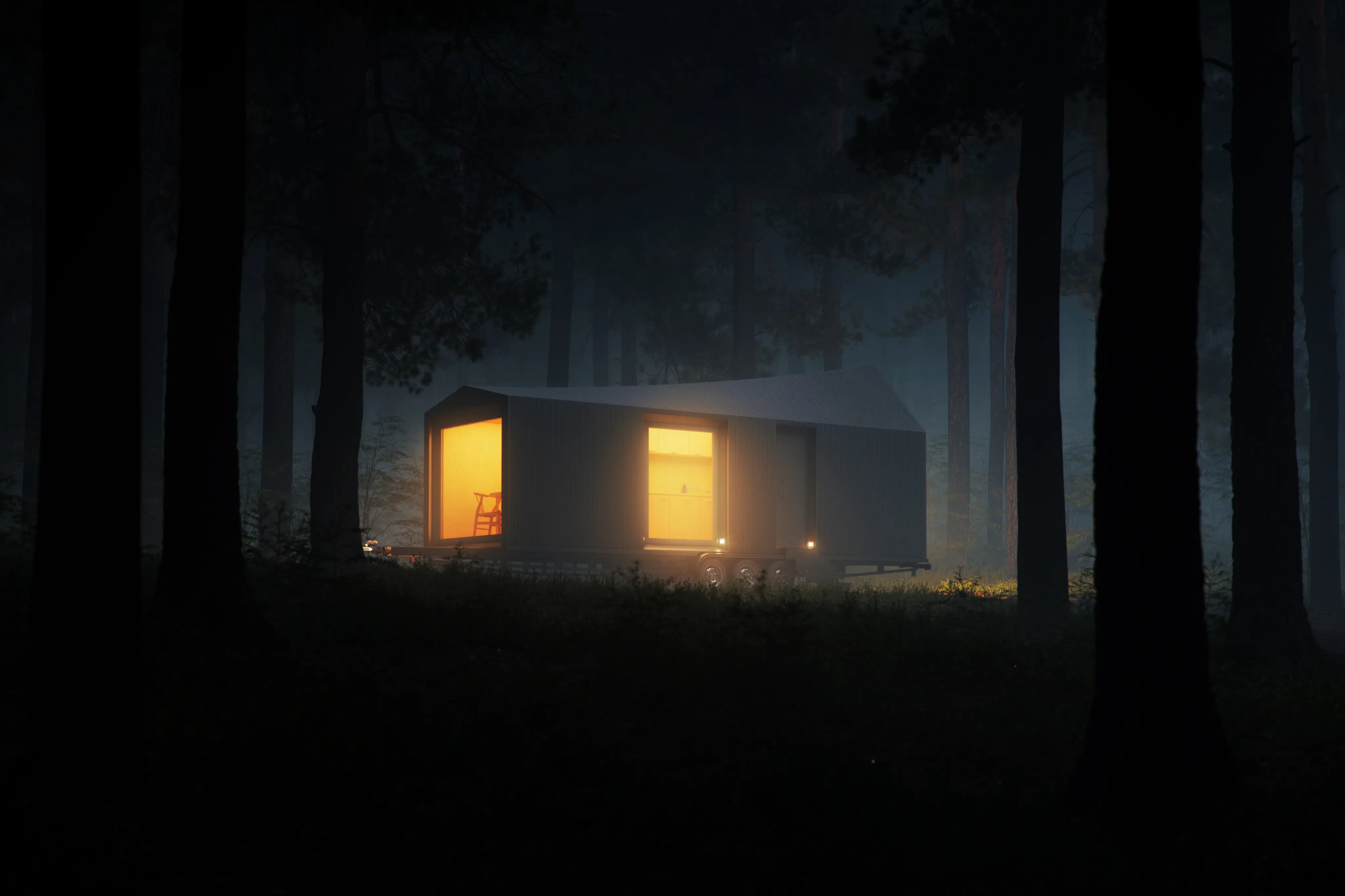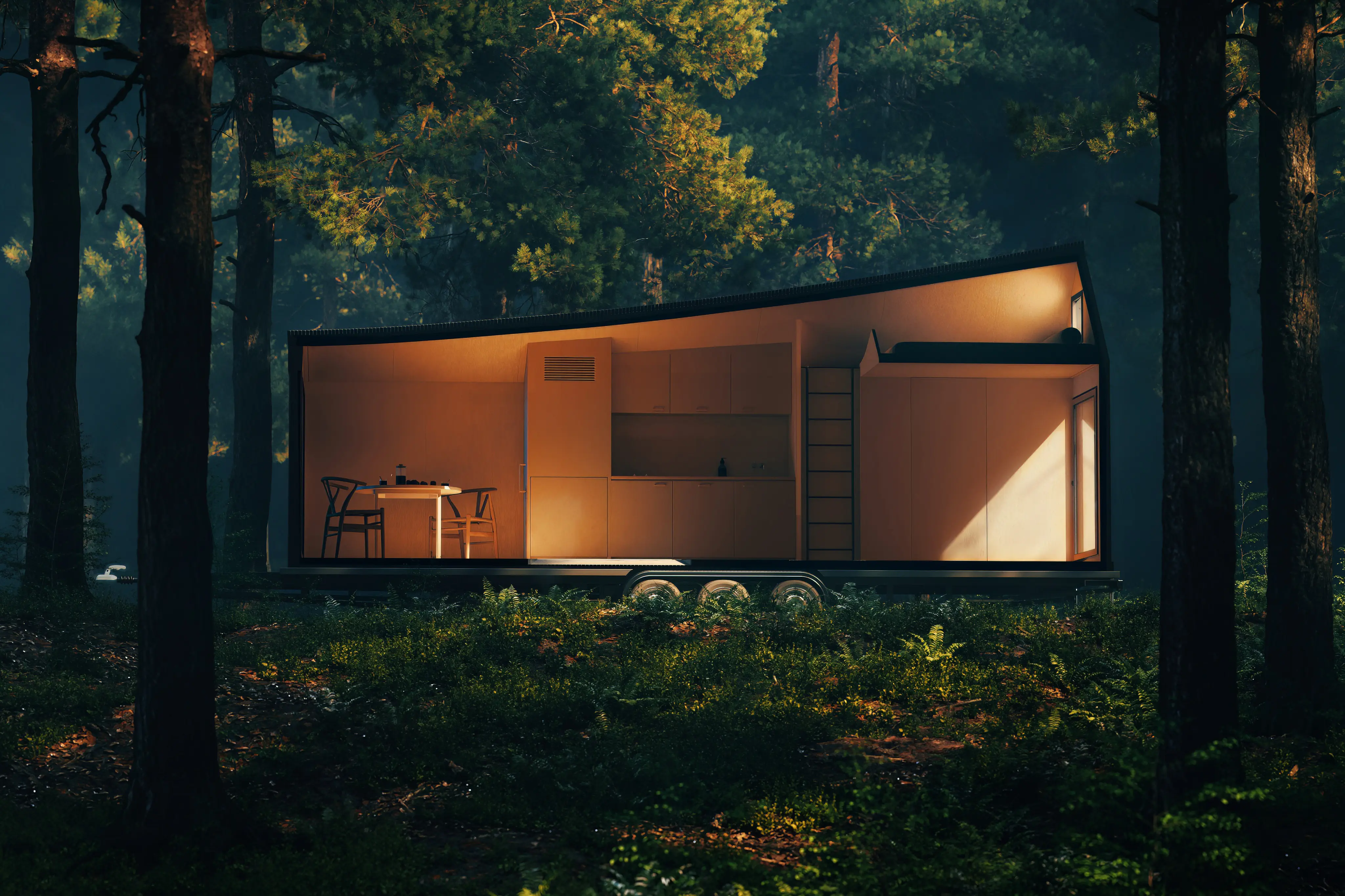 The Forest Retreat is a temporary dwelling unit that is easily transported with a trailer in various locations.